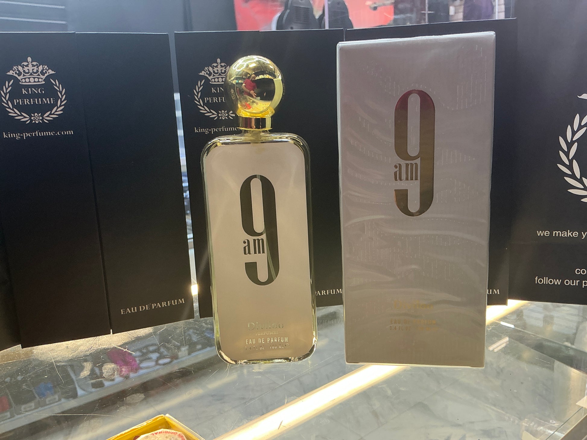 Diviloo 9am White, which features a gentle opening of cinnamon, sandalwood, and benzoin, evolving to a floral heart of rose and jasmine, and a woody base of sandalwood, Oudh, and cedar. This contrasts with Afnan 9am Dive, which is an aromatic aquatic fragrance with citrus, mint, and apple, incense, and spicy ginger and patchouli notes.