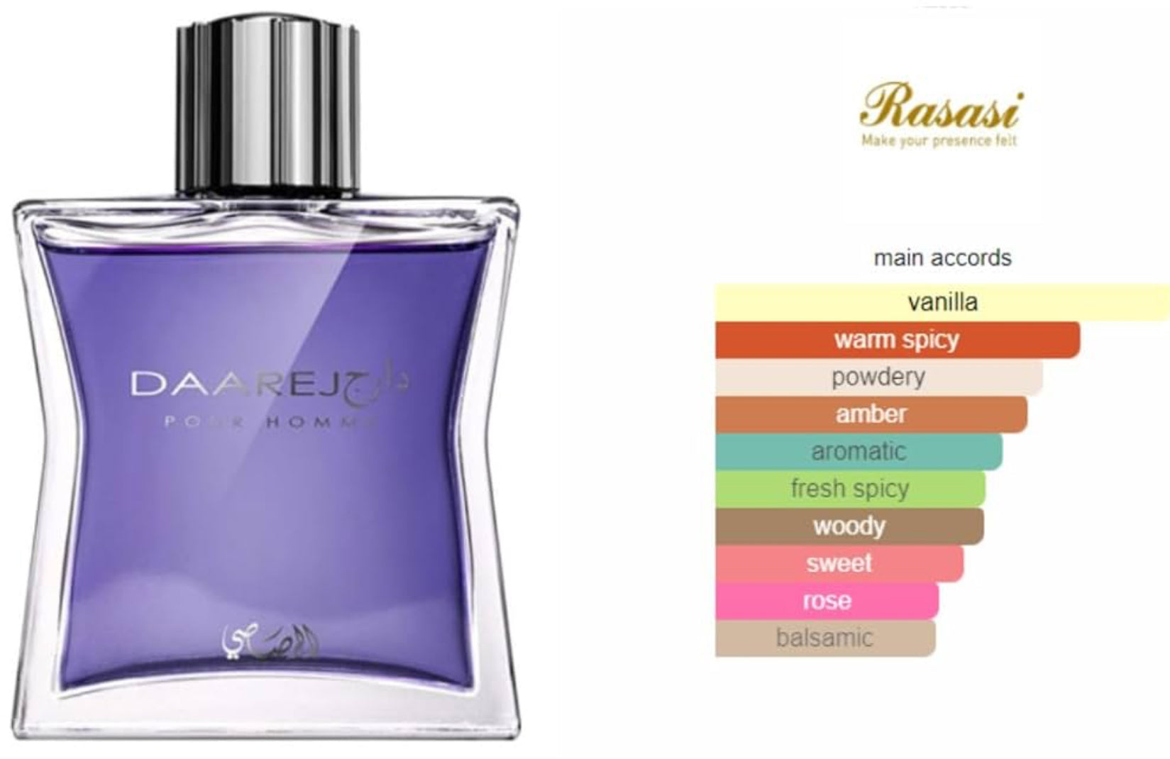 Daarej is a spicy, flirty and romantic concoction that opens on strong spicy notes and meanders through the floral middle notes laced with a whiff of romance by the rose highlights. The base notes of earthy, soft, creamy and lingering notes of sandalwood, tempered to sweet warmth by amber and tonka beans.