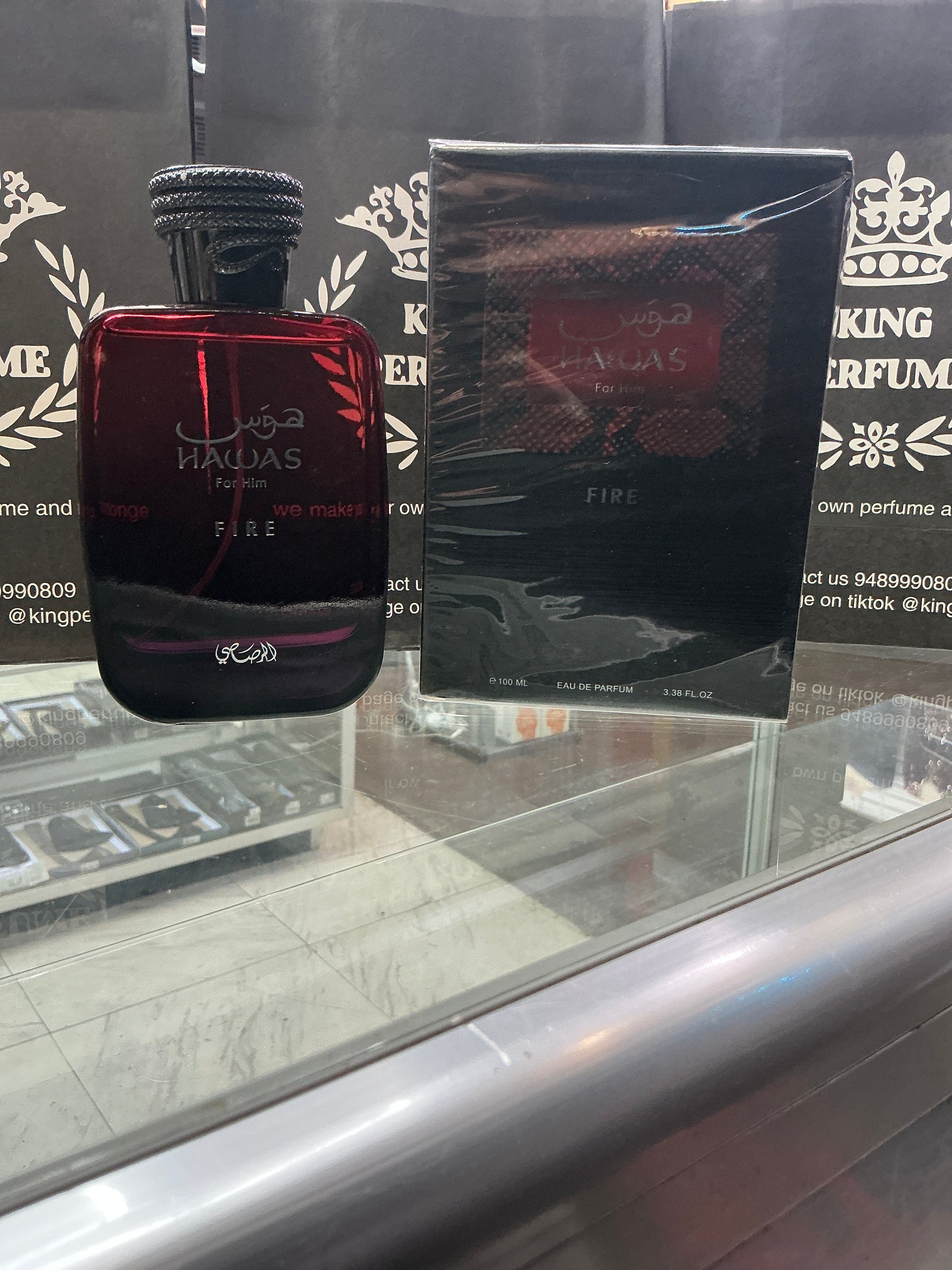 Rasasi Hawas Fire smells like an aromatic aquatic fragrance with a warm, spicy, and fresh profile, blending top notes of clary sage with a heart of Egyptian jasmine and marine notes, and settling into a base of ambergris, mineral notes, and amber, creating an intense, sophisticated, and long-lasting scent. It balances a fresh, clean opening with an exotic floral, aquatic freshness, and finishes with a refined, warm, and sensual trail.